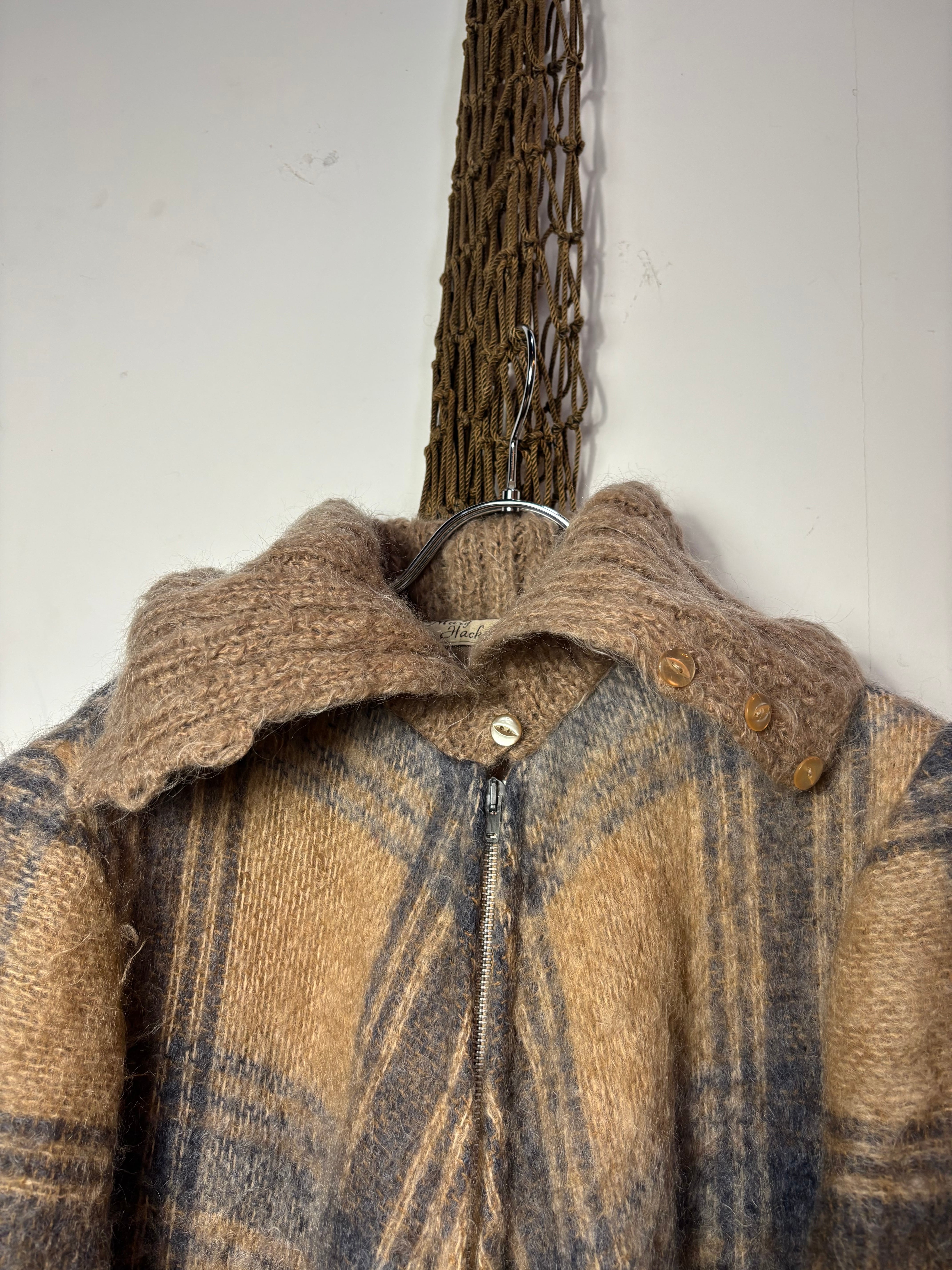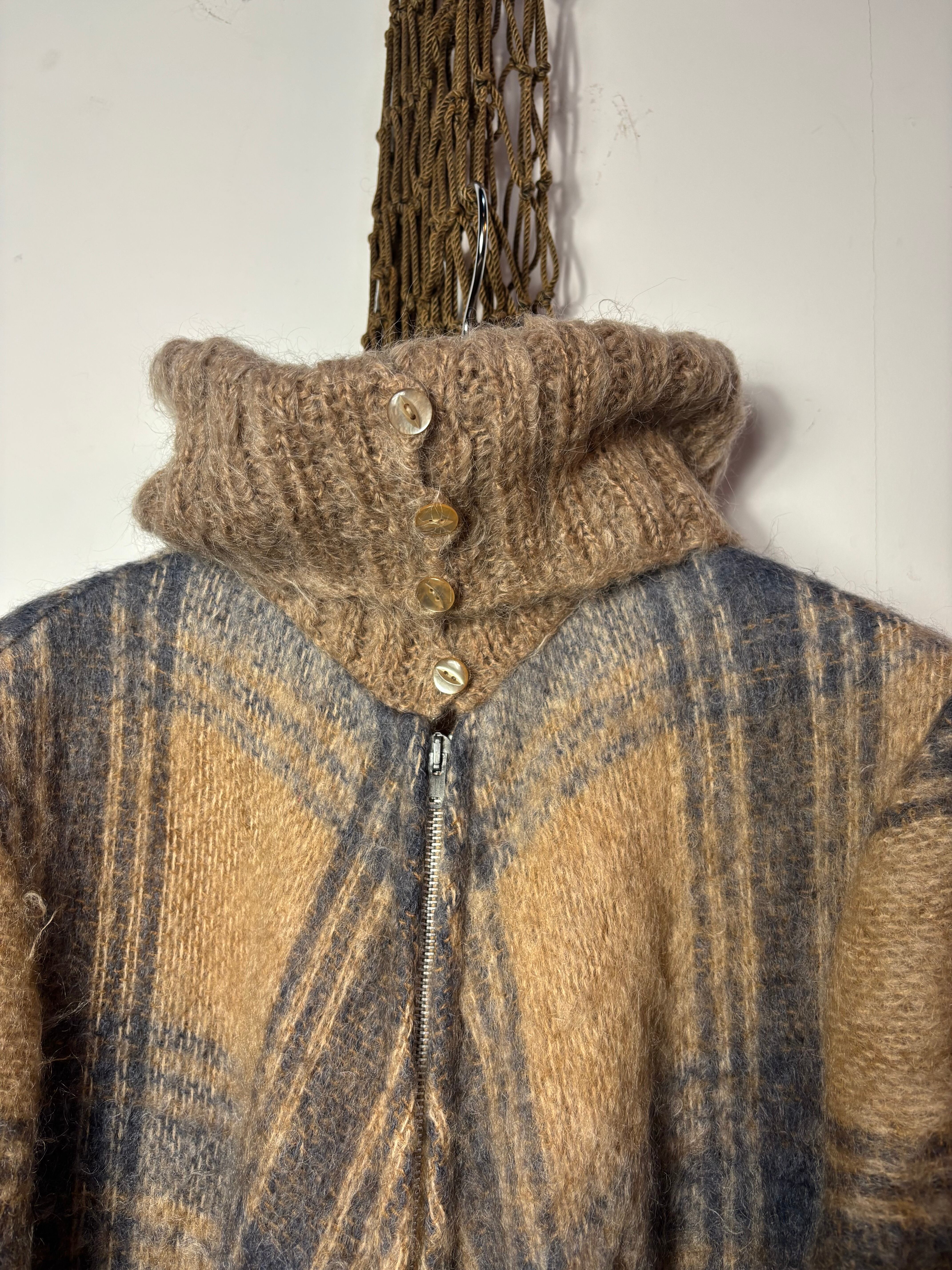 首元に大きな襟がついており、タートルネックの様にボタンで留めれる仕様です。ボタンを留めずに襟を広げても可愛いと思います