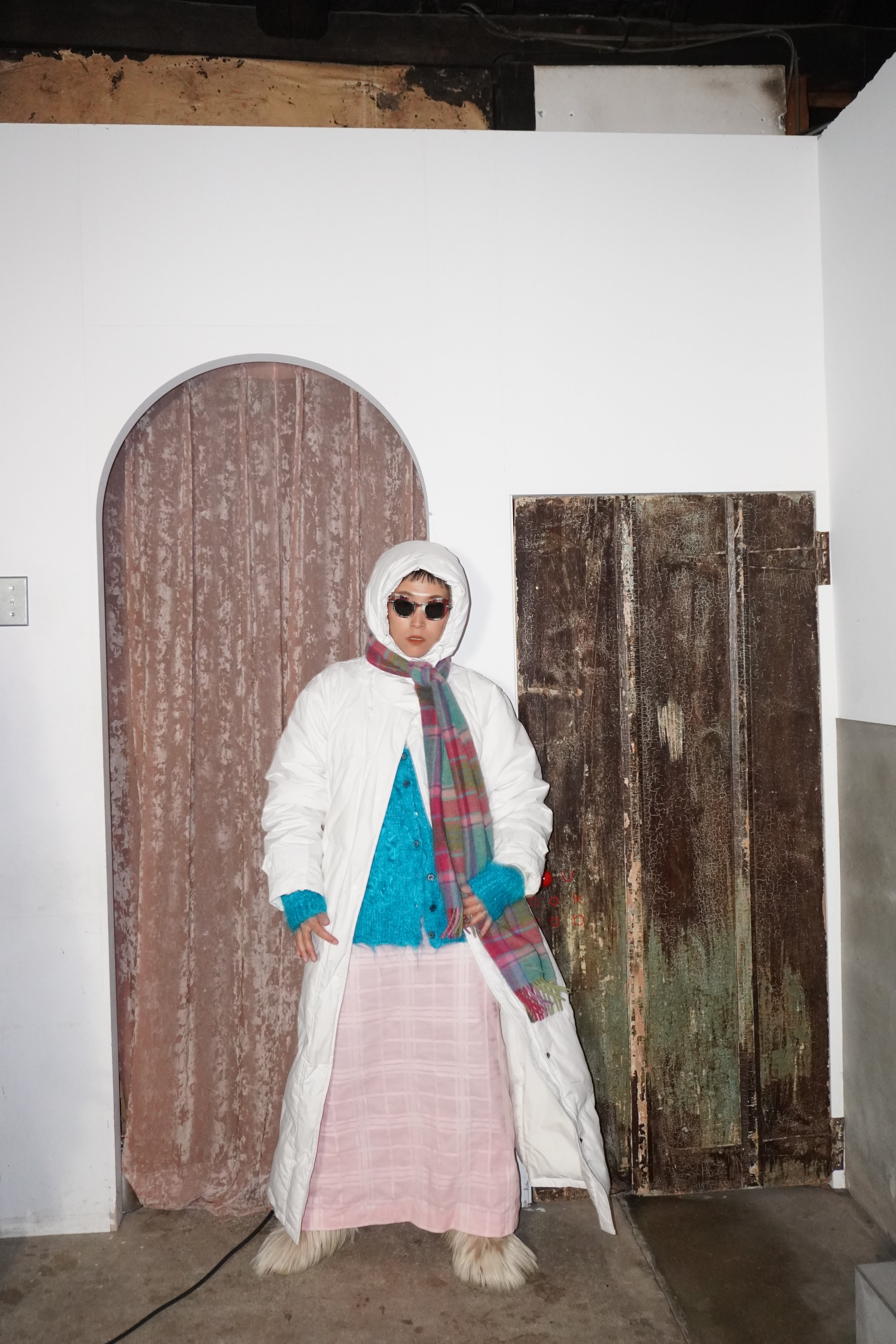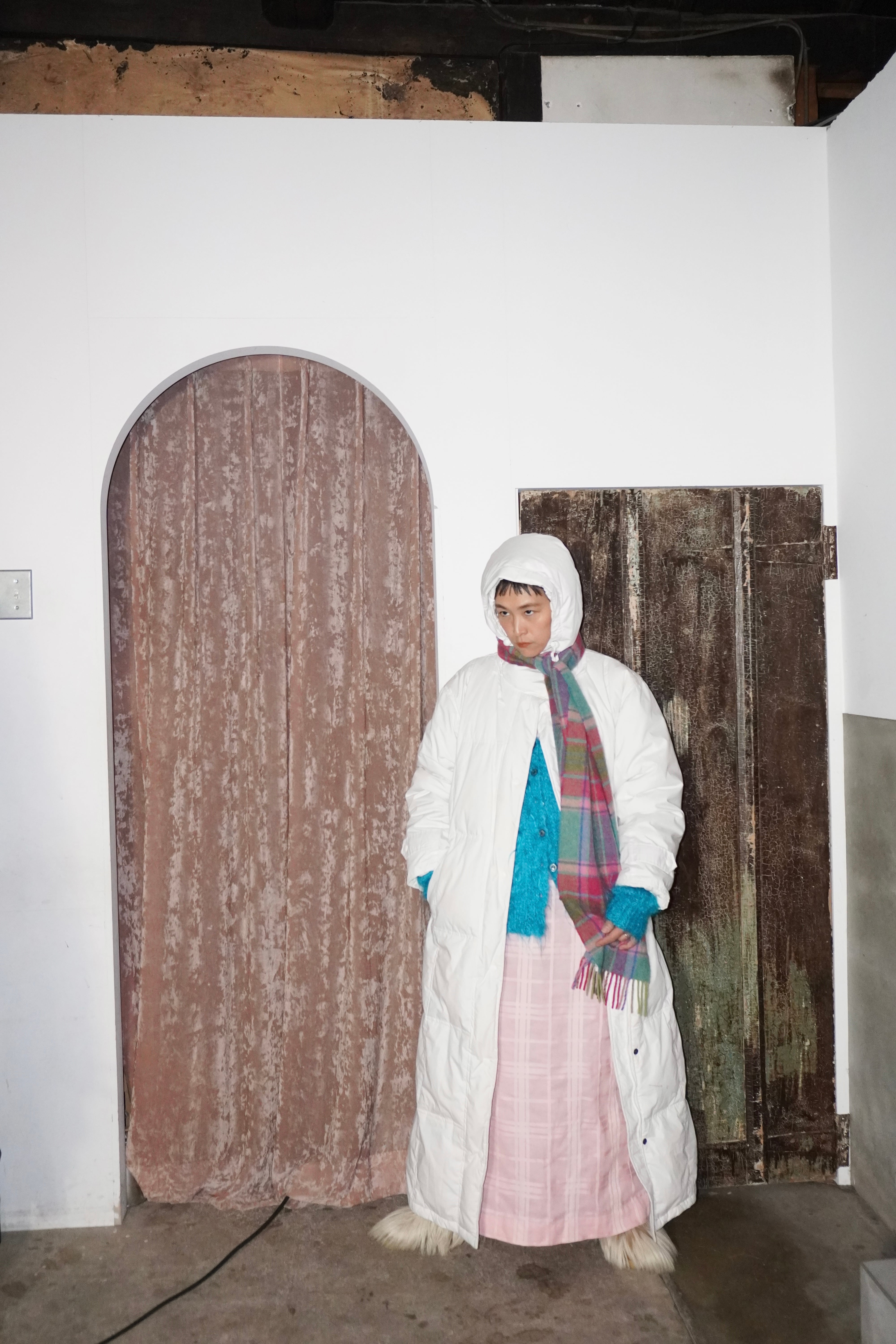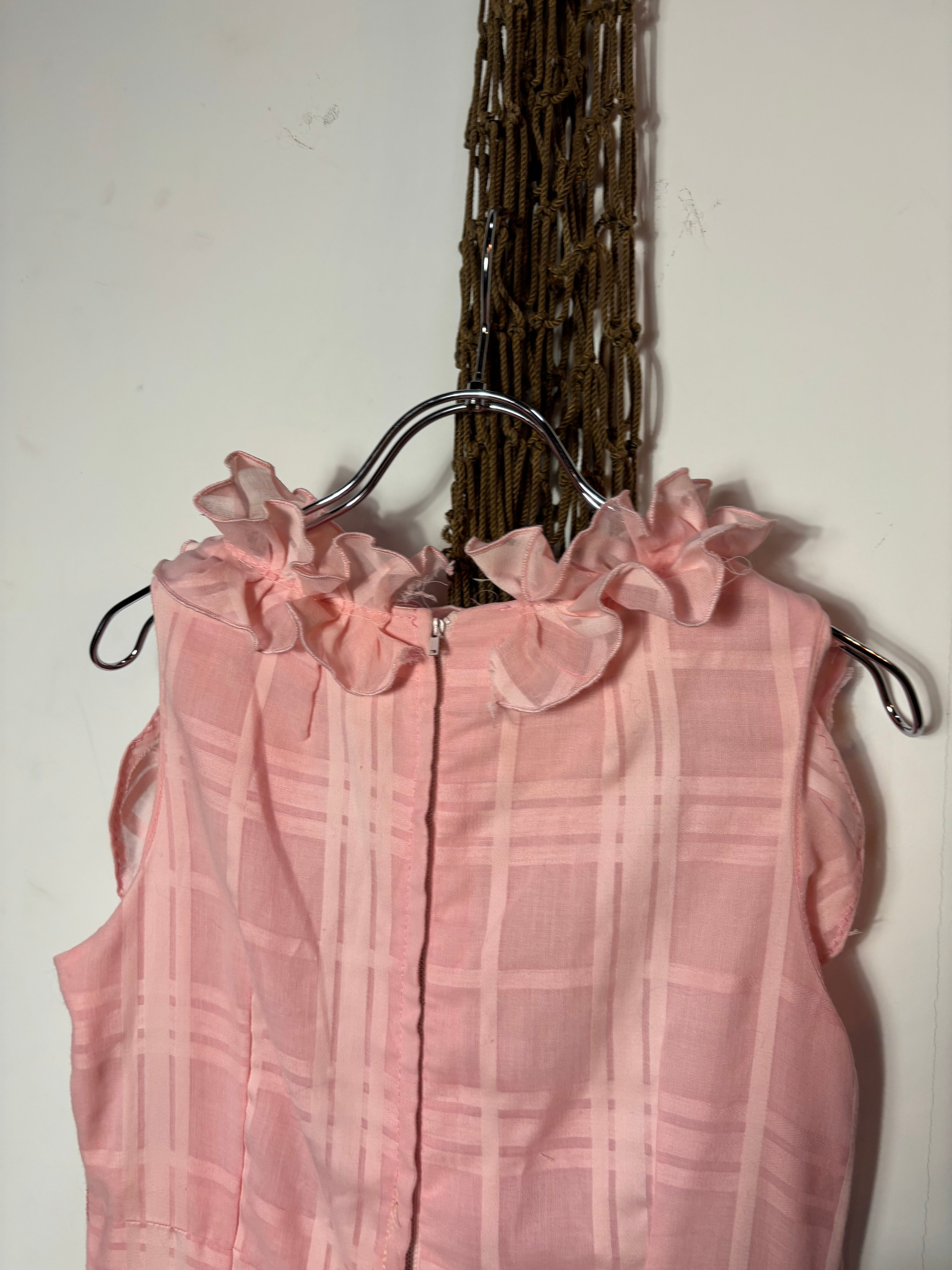 コットン生地のロングワンピースになります。首元のフリルがとても可愛いワンピースです。薄手で裏地はついていません。ペチコートなど入れるのが安心かと思います。